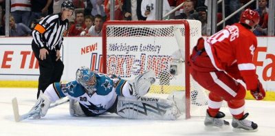 With a little more than three minutes left to play in the first, the Red Wings were dominating the Sharks zone once again. A great move by Todd Bertuzzi found him all alone with the puck. He jetted behind the net and tried a wrap around move on Nabokov but Nabby was able to get his stick down, yet he could not freeze the puck. In a desperate effort, as the Wings crashed the net, Logan couture tried to push the puck under Nabokov but the referee ruled that he had covered the puck with his hand, resulting in a penalty shot for Detroit. The Joe exploded as the fans cheered on Zetterberg, who was chosen to take the penalty shot. He had threatened to score all night and this was a prime opportunity to put the Sharks down 2-0 early in the game. He came in fast on his forehand and faked the shot, which froze Nabokov, and then he went back hand and tried to lift it passed Nabokov - but Nabby, who has one of the best glove hands, robbed Zetterberg and kept it a 1-0 game (play pictured above). But the Red Wings weren't done yet, at 18:37 Dan Cleary once again found himself all alone in the slot with the puck and buried it passed Nabokov: 2-0 Red Wings. The Sharks pushed back even though the period was almost over and they would play until the buzzer sounded. With Setoguchi, Pavelski, and Clowe out on the ice, they battled for an opportunity to cut the deficit in half. Clowe was able to win the battle on the boards and send the puck to Pavelski, who was behind the net. He quickly threw the puck up the slot, hoping to find a Sharks player - and he did. Setoguchi gathered the puck, turned towards the net, and beat Howard glove side with four seconds left in the first: 2-1 Red Wings.